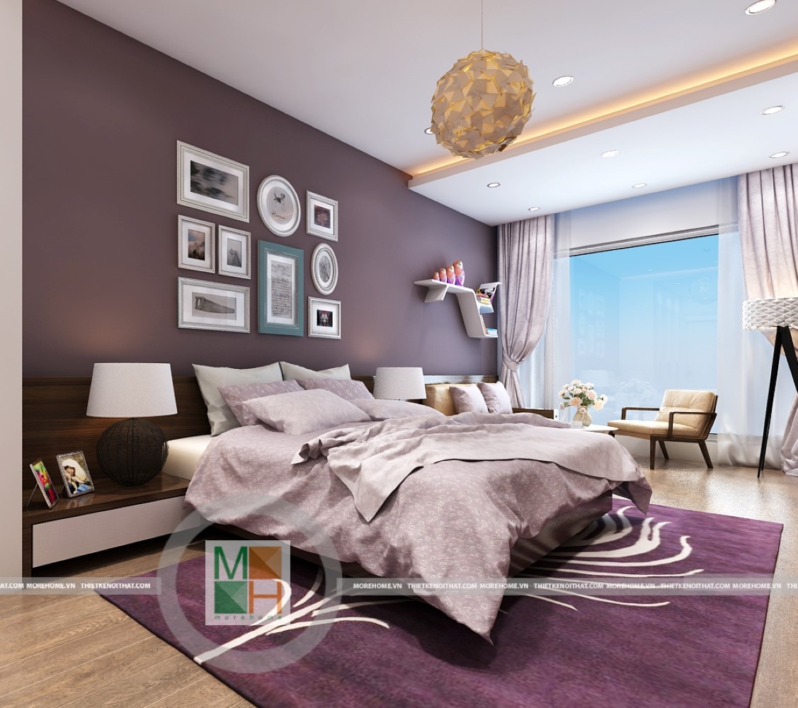 Giường ngủ được thiết kế nệm màu trắng đối lập với ga giường màu trắng tạo nên nét tinh tế, cá tính cho căn phòng. Thêm vào đó là bức tường được sơn hai màu trắng và tím khiến không khí trong phòng dường như ấm cúng , ấn tượng hơn. Vì diện tích căn phòng khá rộng nên chiếc tủ đựng quần áo bằng gỗ công nghiệp được bố trí đặt ở 1 khu vực riêng biệt.